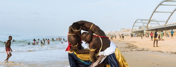„La Lutte“ ist Nationalsport im Senegal und ähnelt dem schweizerischen Schwingen. Am Strand von Dakar entstanden beeindruckende Fotos, die die Sportler in Damast von Getzner Textil zeigen.